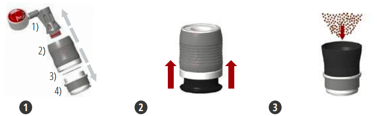 1. Scheid de brouwkop - Scheid de kop in vier delen: 1) Zuiger 2) Brouwcilinder met zuiger 3) Zeef 4) Portafilter.