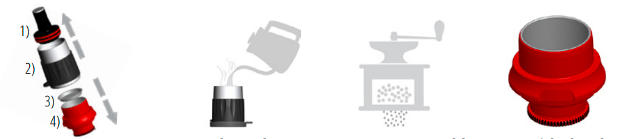 - Scheid uw brouwkop - Scheid de brouwkop in vier delen: 1) Zuiger, 2) Cilinder, 3) Zeef, 4) Portafilter. Tip: Gebruik de doseerbeker om de zuiger te verwijderen.
