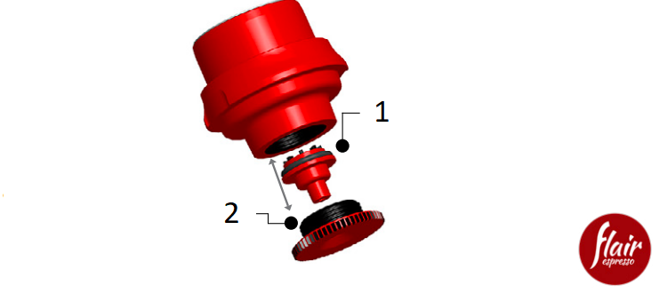 Uw Flex wordt geleverd met twee "trainingsschijven" (rood), waarvan er één in de zuiger is geïnstalleerd. Gebruik deze rode schijf wanneer u de juiste hendelkracht heeft bepaald. De folieafdichting van de trainingschijf (red) zal breken als er te veel kracht op de hendel wordt uitgeoefend, wat aangeeft dat uw gemalen koffie te fijn is. Als de folie breekt, stroomt er water in de zetkop. Herhaal de test met een grovere maling (probeer de consistentie van fijn zeezout als u een Flow-Control Portafilter gebruikt) en herhaal de test met de tweede rode schijf.