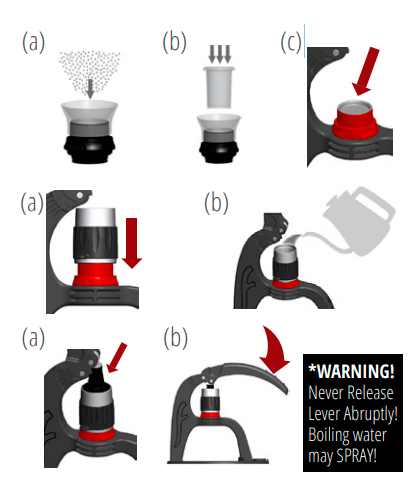 (a) Bevestig de trechter aan de geselecteerde Portafilter en vul deze met (a) Leeg het voorverwarmde water, verwijder Preheat cap en (a) Plaats de zuiger bovenaan de cilinder. (b) Druk langzaam op de *WAARSCHUWING! - Laat de hendel nooit abrupt los! Er kan kokend water SPRAYEN! | ![]() |