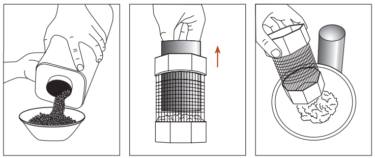 Laat de aluminium schoorsteen een paar minuten volledig afkoelen. Verwijder na afkoeling het deksel van de kafopvangbak, haal de aluminium schoorsteen eruit en leeg het kaf in de compost. Mogelijk kunt u meerdere keren roosteren voordat u de kafopvangbak moet legen, maar zorg ervoor dat deze niet verder dan halverwege het gaas gevuld raakt. Controleer na het legen of de aluminium schoorsteen weer goed in het plastic gedeelte zit.