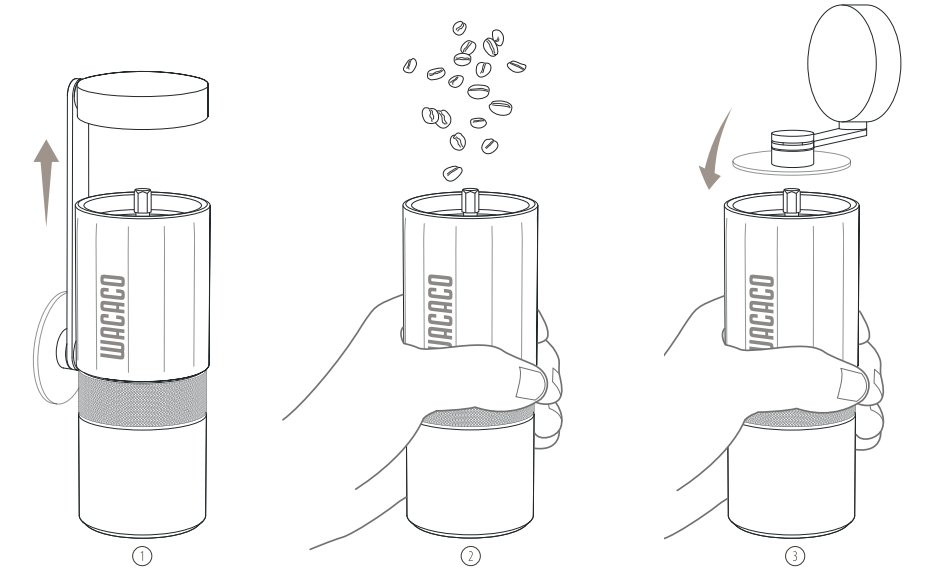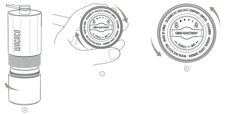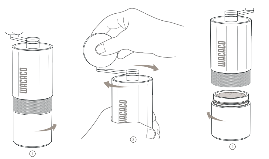 8. Houd het hoofdgedeelte met één hand vast en draai de hendel met de klok mee met uw andere hand totdat alle bonen gemalen zijn.